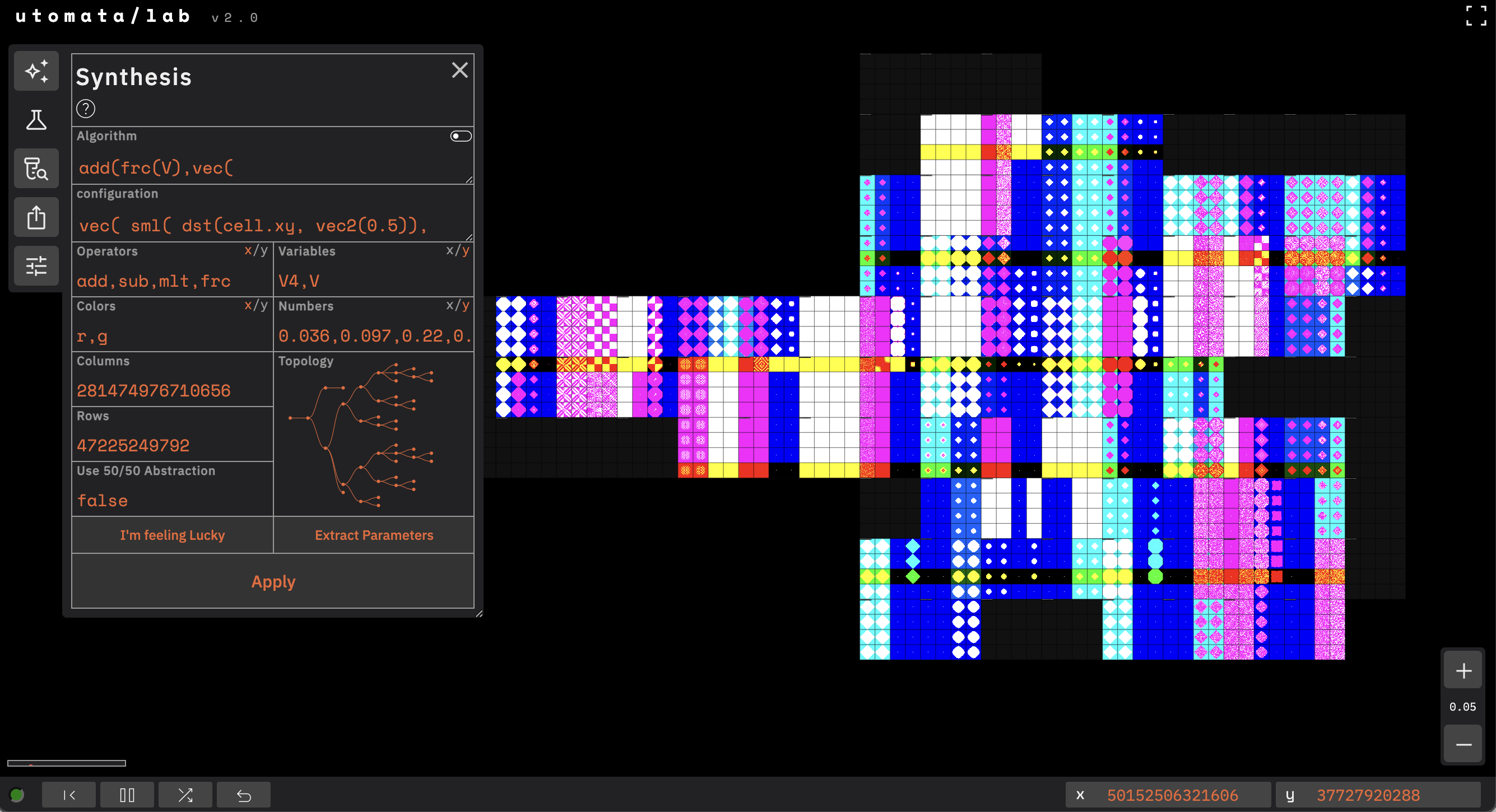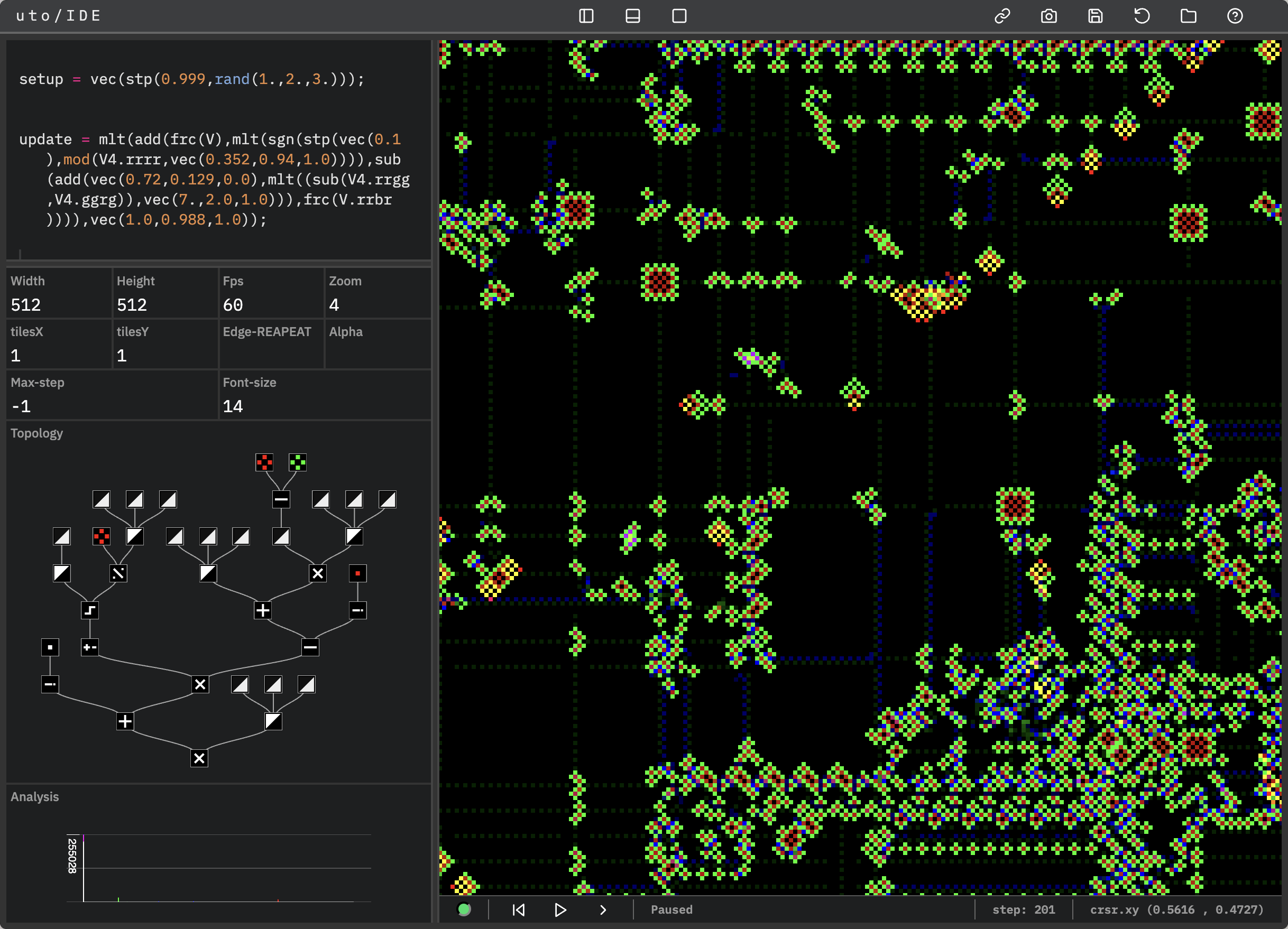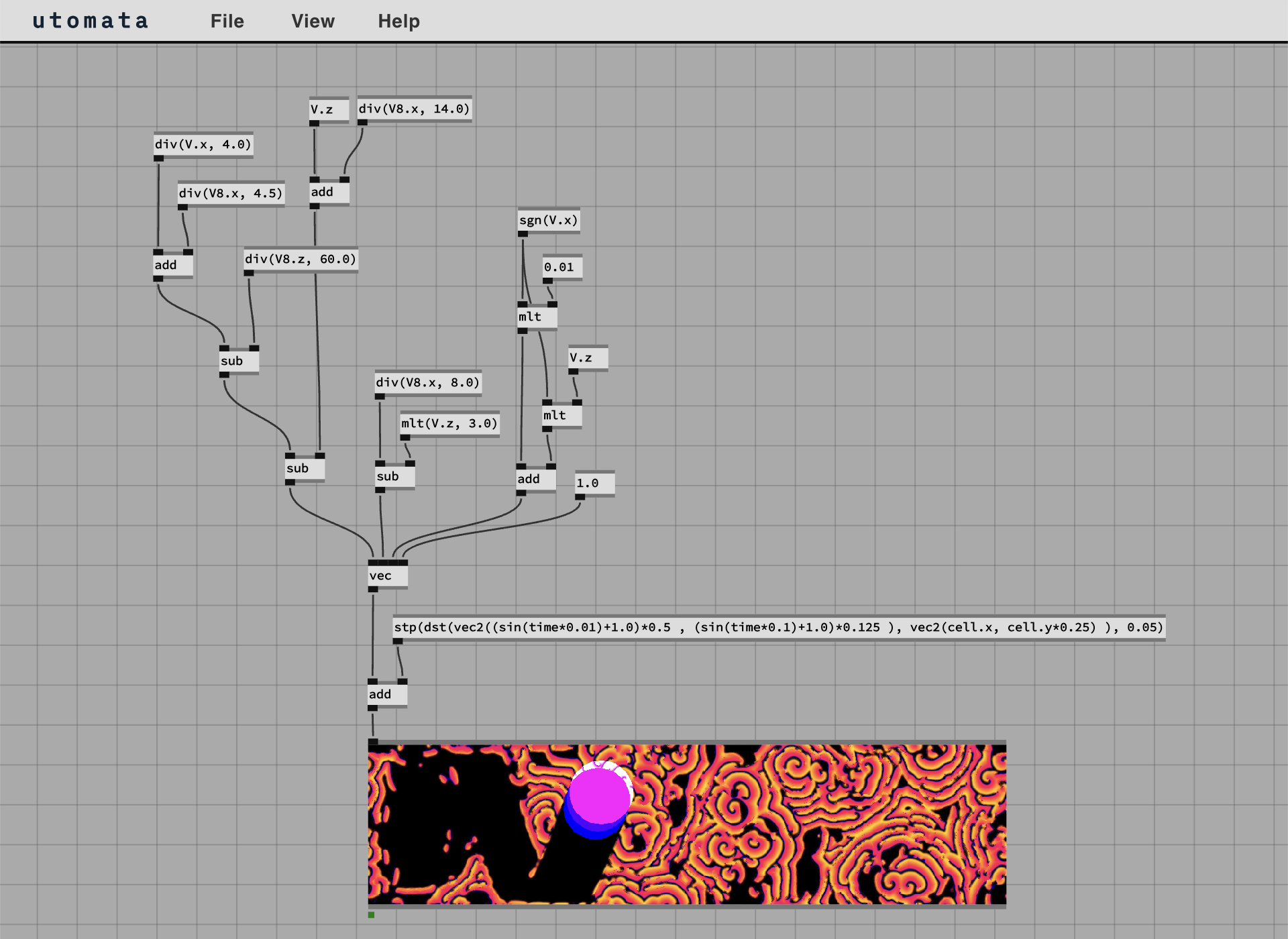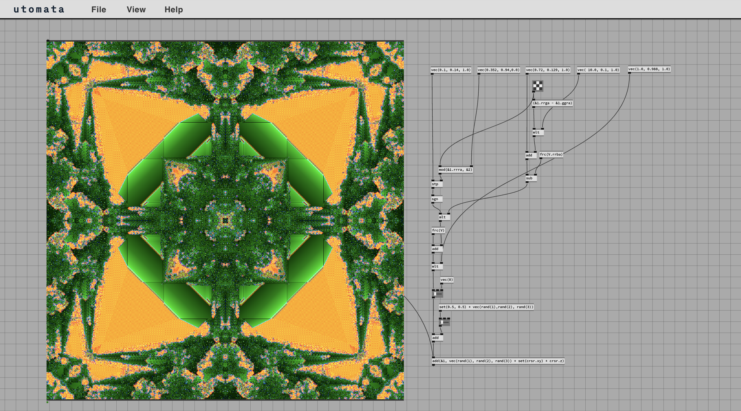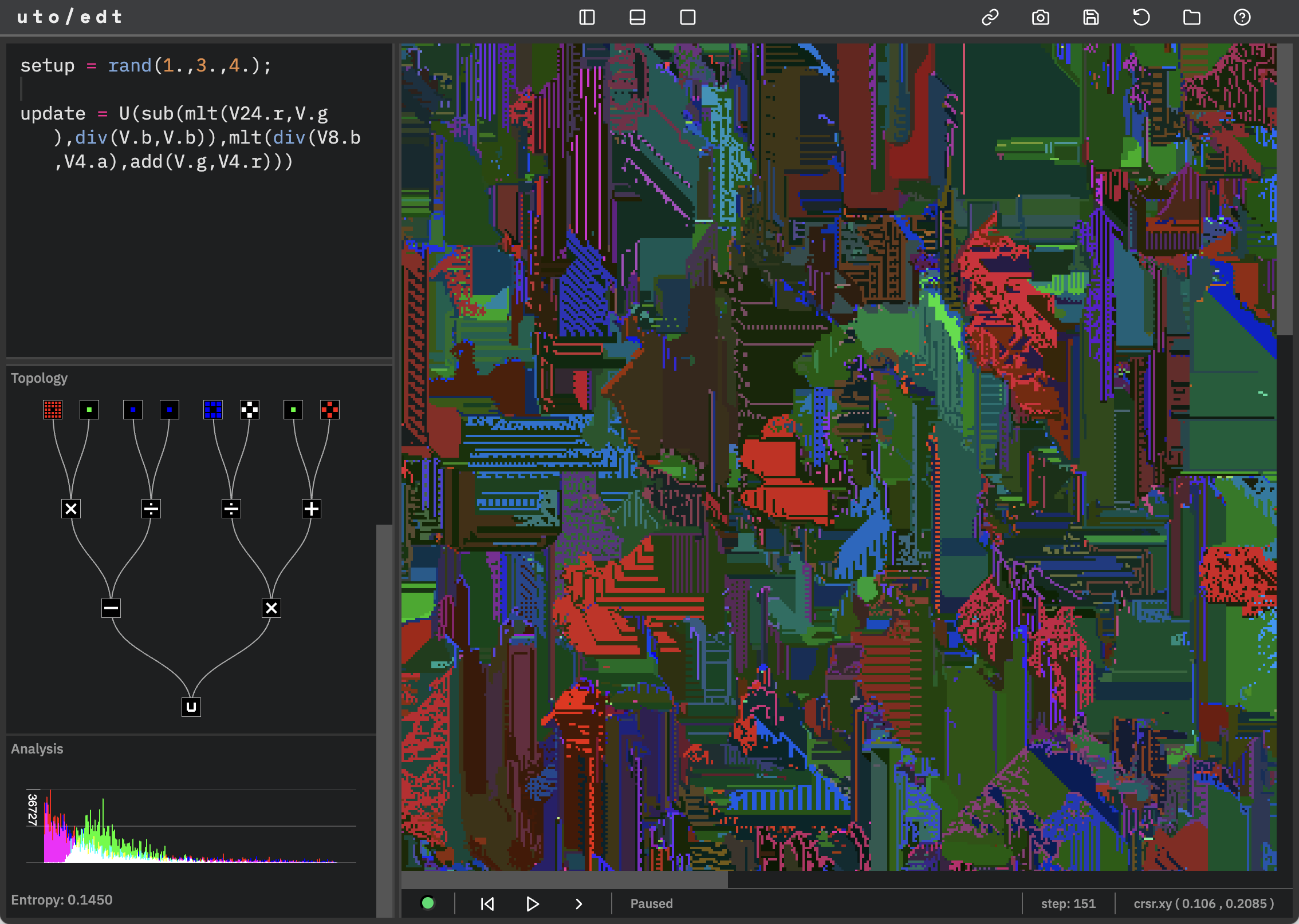 Designed for open-ended exploration, Utomata encourages playful, expressive, and improvisational programming. It supports large canvas sizes and running multiple algorithms concurrently, allowing exploration through visual, interactive, or automated experiments.