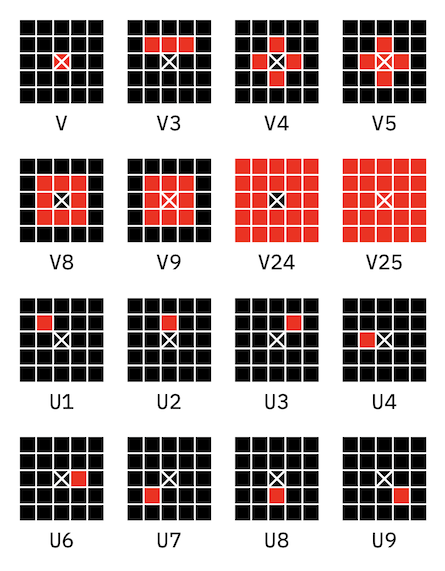 Utomata features a comprehensive set of built-in neighborhood variables that support both totalistic and outer-totalistic CA. The V variables represent totalistic neighborhoods, where each cell interacts with its surrounding cells by using a total sum of their states. U variables represent outer-totalistic neighborhoods, allowing specific neighbors to be sampled.